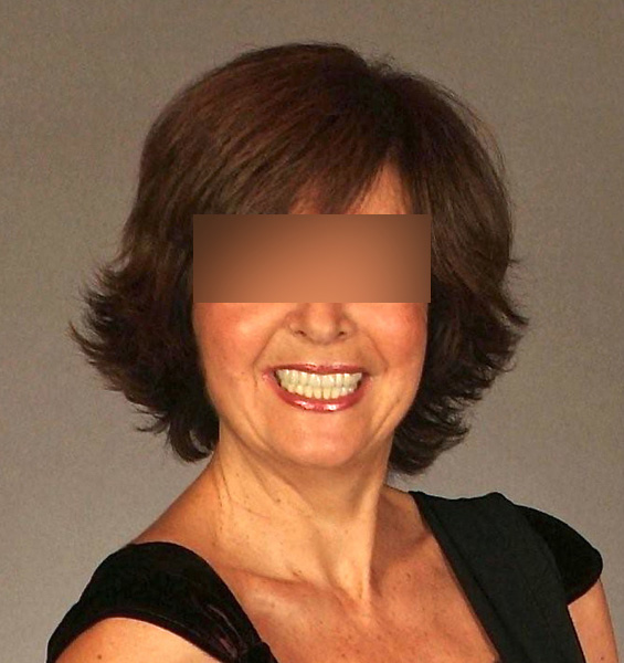 Cette patiente n’a pas souhaité avoir de greffes d’os et de gencive sur la partie antérieure de son maxillaire supérieur, ce qui aurait permis de faire des implants. Après avoir mûrement réfléchi, son choix s’est porté sur deux bridges classiques céramiques (supérieur et inférieur) afin de restaurer totalement sa denture, mais aussi de restructurer son visage.